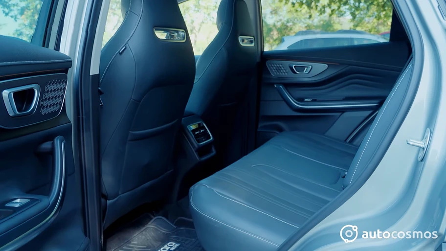 En las plazas traseras el espacio es muy bueno, tanto para la altura como para la cabeza, e incluso a lo ancho, pudiendo entrar tres adultos con relativa comodidad. Y en cuanto a las amenidades, encontramos lo esperable en este segmento: iluminación LED, manillas de retorno suave, salidas de aire, espacio para guardar cosas en las puertas, puertos USB, un aviso en la puerta que se pone en color rojo cuando se aproxima un vehículo, y un enorme techo panorámico que inunda de luz la cabina.