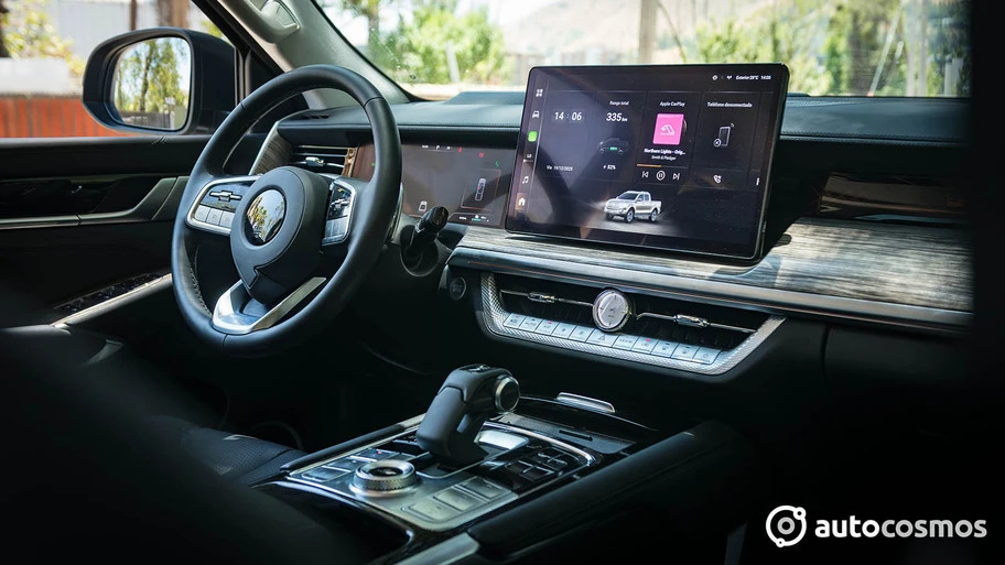Y aunque es obvio que los acabados de madera no son reales, por supuesto que hace que se vea muy bien, al igual que el cuero sintético, muy por encima de la media, de buen grosor y grano, los acentos metalizados, el cielo de gamuza o el detalle de tener un reloj analógico, cosas que no acostumbramos a ver en este segmento. A esto se suman elementos de diseño propios de GWM como el selector futurista para la transmisión o el enorme volante cuya masa oculta el logo de Poer.