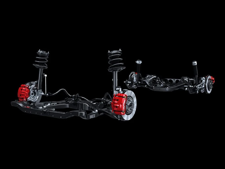 Adicional a lo anterior, viene equipada con amortiguadores de alto rendimiento corrigiendo rápidamente la deformación que se produce durante la conducción y suprimiendo las torsiones incómodas y el comportamiento inestable. Además, el refuerzo de los tirantes de la suspensión trasera mejora la sensación de dirección directa.