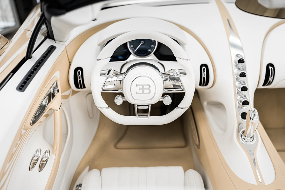 Las distintivas líneas divisorias blancas y doradas, se lograron mediante un proceso excepcionalmente complejo. Desde la meticulosa aplicación de cintas y enmascaramiento a mano hasta la cuidadosa pintura de la carrocería, se invirtieron cientos de horas y un trabajo artesanal excepcional para materializar la visión del diseño, en un proceso apasionado, típicamente Bugatti de principio a fin.