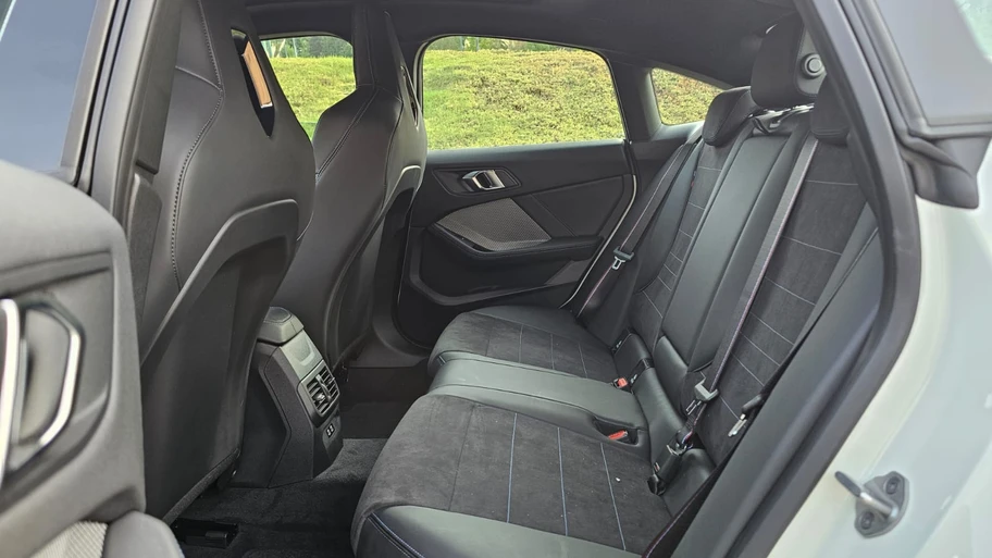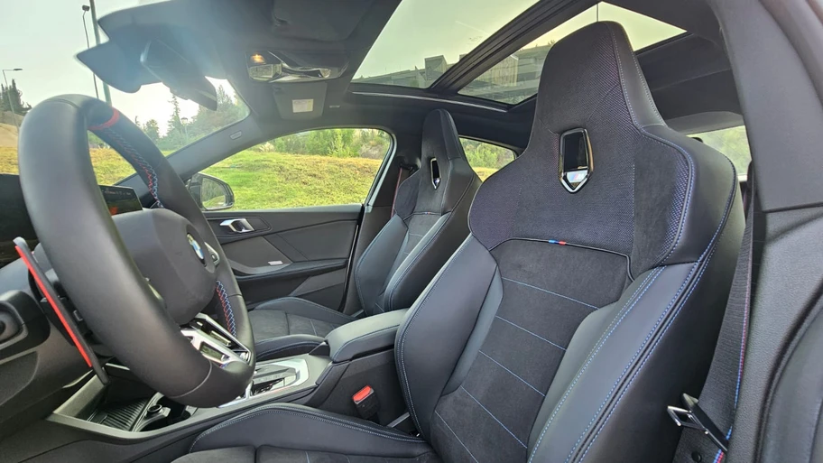 Los asientos delanteros son butacas M con tapizado en Alcantara y costuras con los colores rojo, azul y celeste de la división deportiva, con ajuste eléctrico y memoria, que combinan un agarre muy bueno con una comodidad para el día a día que es poco habitual en este tipo de butacas, que suelen sentirse duras en viajes largos.