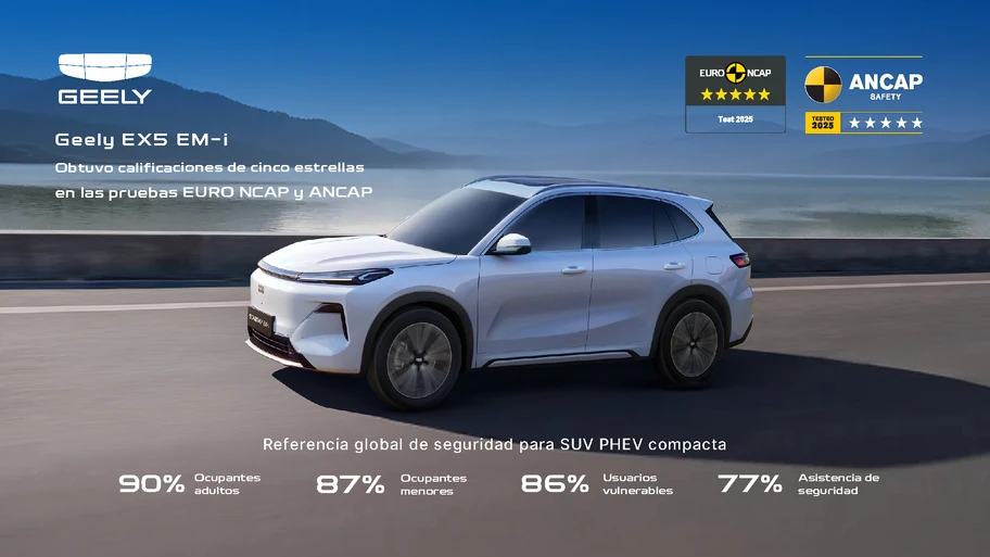 Estos organismos de evaluación cuentan con estrictos protocolos con los que evalúan protección para ocupantes adultos e infantiles, seguridad para peatones y desempeño de sistemas de asistencia activa. En este caso, el Geely EX5 EM-i destacó en todas las categorías al obtener cinco estrellas, cumpliendo con los estándares más altos en seguridad automotriz.
