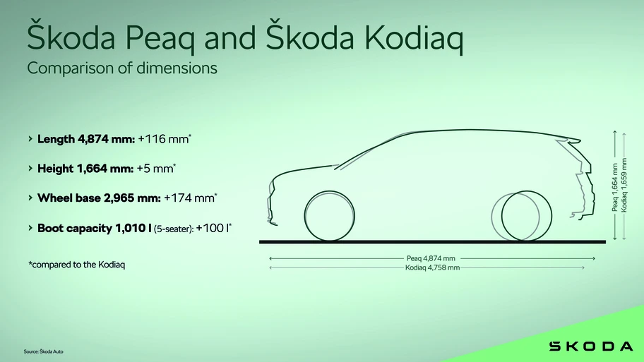 Con 4.874 mm de largo, 1.664 mm metros de alto y una distancia entre ejes de 2.965 milímetros, el Peaq se posiciona como el modelo más grande y espacioso de la gama de Škoda. La marca indica que los pasajeros de la segunda fila gozan de 58 mm extras de espacio para las piernas, que llega a los 84 mm en el caso de la tercera corrida, mientras que la volumetría de su maletero va desde los 299 a los 1.010 litros, con los asientos plegados, lo que lo deja ligeramente por sobre la del Kodiaq. Como buen eléctrico y Skoda "Simply Clever", tiene un maletero delantero con 37 litros capacidad.