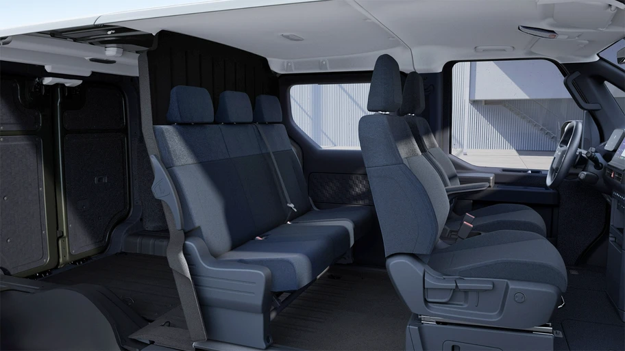 Basada en el furgón L2H1, el nuevo PV5 Crew ofrece un habitáculo flexible, donde es posible cambiar de una configuración de carga de dos asientos a una de pasajeros de cinco asientos. Basta utilizar una palanca que libera el asiento reclinable, inclina el cojín y desliza la mampara prácticamente sin esfuerzo.