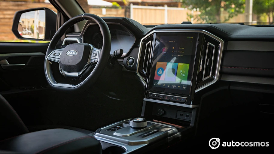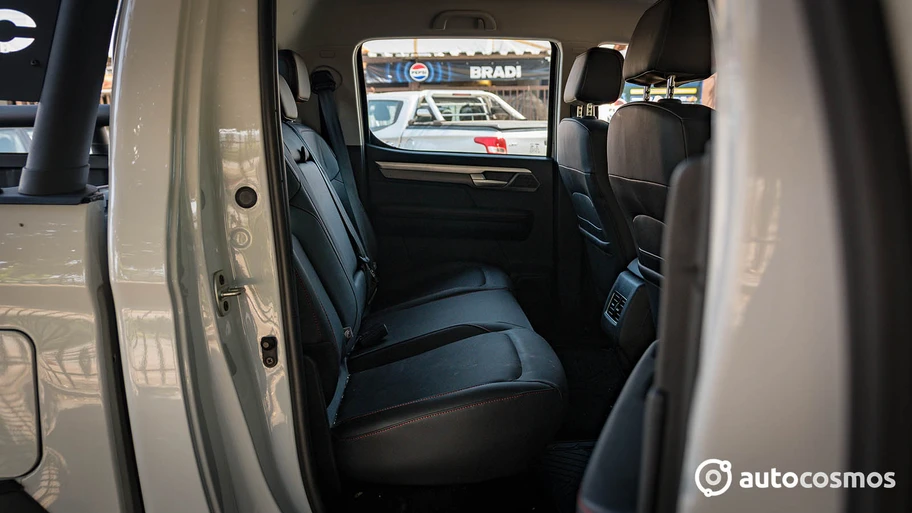 El interior toma un aspecto muy de SUV y más alejado de las primeras iteraciones relacionadas con esta camioneta. Por supuesto que no es el habitáculo más moderno del segmento, pero lo bueno es que, como se trata del interior de la T9 convencional, la calidad percibida es mejor que en sus rivales, algo que se nota tanto en los materiales usados como en el confort de los asientos y detalles como los acentos metalizados (incluyendo un anillo tipo "rally" en la parte superior del volante). Lo único que cambia con respecto a la T9, es el selector giratorio de la transmisión.
